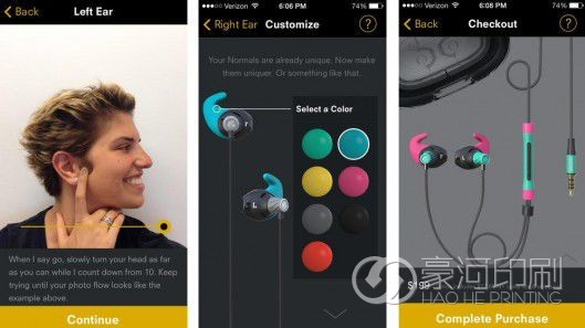 獲得一副剪裁好的耳機(jī)的整個(gè)過程顯得非常簡單。使用Normal iOS/安卓程序,買主把每只耳朵的照片都用智能手機(jī)的相機(jī)排起來。放一個(gè)硬幣(美國的25美分硬幣)靠近耳朵,這樣Normal軟件就能測試到其大小了。然后就是耳機(jī)個(gè)性化的時(shí)刻了。